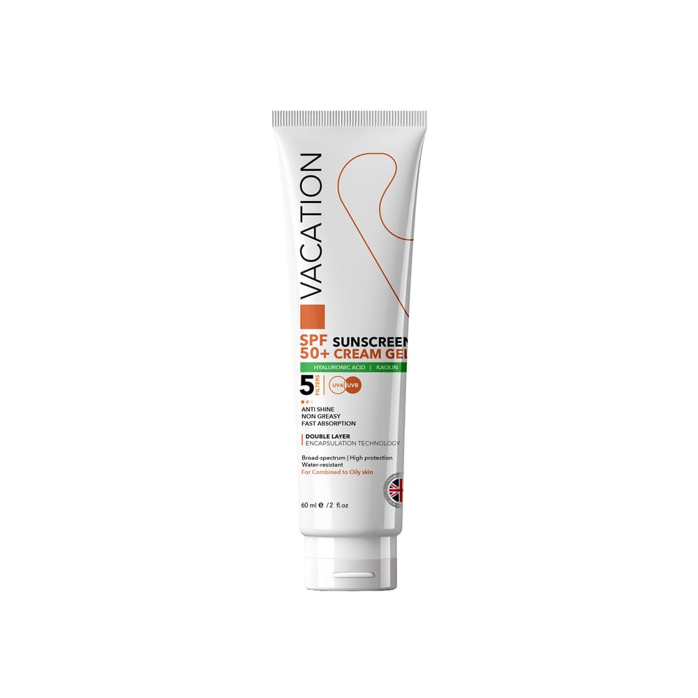 يوفر چل الوقاية من أشعة الشمس Vacation SPF 50+ حماية عالية من أشعة UVA/UVB بتركيبة خفيفة الوزن ومقاومة للماء مثالية للبشرة الدهنية والمختلطة. غني بفيتامين E، يرطب البشرة بعمق ويؤخر ظهور التجاعيد ويمتص بسرعة ويترك لمسة نهائية غير دهنية وغير لامعة بدون أي أثر أبيض